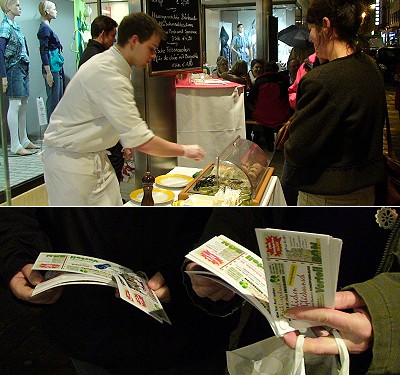 Nur wenige Einkäufer zeigten am Abend Interesse am Shoppingevent und konnten sich dafür umso entspannter in den Räumen der beteiligten Geschäfte umsehen. Vor dem Modehaus Müller bot das Hotel "Krone-Post" Leckereien wie Austern und Thunfisch-Wraps an, bei denen sich mit einem guten Wein der stressfreie Einkaufsbummel angenehm abrunden ließ (Bild oben). Die Eberbacher Werbegemeinschaft verteilte druckfrische "EWG-Schnäppchen-Blocks" mit vielen Vorteil-Bons von Eberbacher Geschäften (Bild unten).