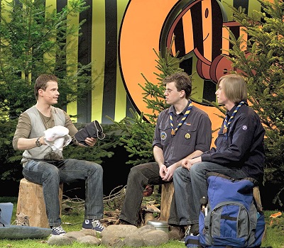 Sendungen werden im Mai bzw. Juni ausgestrahlt V.l.: Moderator Pete Dwojak mit den Silberreihern Dimitri Münch und Yannick Mayer. (Foto: SWR)(bro) (dg)Im Januar erreichte eine Anfrage des SWR über den BdP Landesverband Baden-Württemberg den Pfadfinderstamm Silberreiher aus Eberbach. Der Fernsehsender suchte für den Tigerenten Club und den Tigerenten Club Xtra zwei Pfadfinder, die sich auch mit Geocaching auskennen. Geocaching bezeichnet eine moderne Form der Schnitzeljagd mit Hilfe von Satellitennavigation. Yannick Mayer und Dimitri Münch meldeten sich freiwillig für den Auftritt.