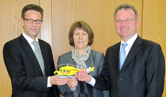 Fliegende Wollmilchsau landet heute an der DRK-Rettungswache - Pilotprojekt im ländlichen Raum V.l. der Vorsitzende der CDU-Landtagsfraktion Peter Hauk, Landtagsabgeordnete Elke Brunnemer und Eberbachs Bürgermeister Bernhard Martin mit einem Modell von „Christoph Eberbach". (Foto: RotoryClub)(hr) "Christoph Eberbach", auch genannt die "fliegende Wildsau", kreist künftig über Eberbach. Das Land Baden-Württemberg und die Stadt Eberbach starten ein gemeinsames Pilotprojekt für den Rettungshubschrauber in der Stauferstadt.