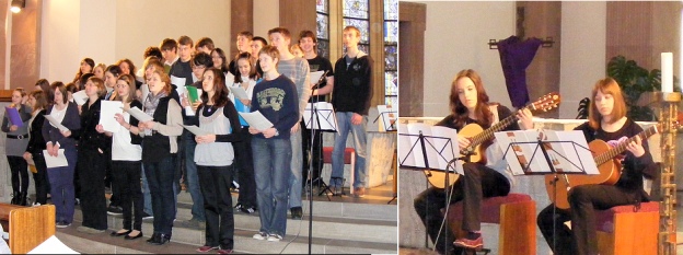 Stimmungsvoller Gottesdienst am letzten Schultag vor den Osterferien Links: Der Oberstufenchor trägt die mittelalterliche Sequenz "Stabat Mater"" während der Schriftlesungen vor. Rechts: Anna und Lena Vogl begeistern die Gottesdienstbesucher mit ihrem