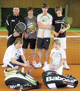 Aufstieg in die erste Bezirksliga V.l.: Trainer Matthias Voigt, Sebastian Geier, Oscar Sittig, Lasse Schulz und Manuel Bansbach mit Leo Steiner (vorne kniend v.l.). (Foto: privat)(bro) (sch) Die Juniorenmannschaft U16 ist nach der Winterhallenrunde in die erste Bezirksliga aufgestiegen. Durch das intensive Training bei der Tennisschule Matthias Voigt besiegte das Team den TC Sandhausen mit 5:1, TV Germania 1890 Großsachsen 4:2, TC Mühlhausen mit 5:1, TSG Germania Dossenheim nach Punkten 3:3 und den TC Hockenheim mit 5:1 und wurde damit Gruppenerster.