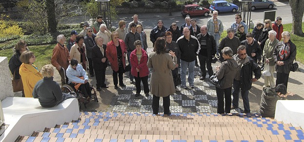 In Darmstadt unternahm die Gruppe eine Stadtrundfahrt. Man erfuhr sehr viel Neues und Interessantes über die Wissenschaftsstadt Darmstadt, z. B. das Darmstadtium, im Sprachgebrauch auch "Scheppe Schachtel" genannt, oder die erste katholische Kirche in Darmstadt, die man wegen der runden Kuppelform als "Käsglock" betitelt. Die Fahrt führte weiter zur Waldspirale, einer von "Hundertwasser" entworfenen, sehr interessanten Wohnanlage, bei der nichts gerade ist und kein Fenster dem anderen gleicht. Der Abschluss der Stadtrundfahrt führte auf die höchste Erhebung von Darmstadt, die "Mathildenhöhe" mit ihrem 50 Meter hohen Hochzeitsturm. Im Anschluss ging es zum "Europäischen Satellitenkontrollzentrum" (ESA), wo ein interessanter Film gezeigt wurde - verbunden mit einer Führung durch das Kontrollzentrum. Indem die ESA die Ressourcen von 18 Mitgliedsstaaten bündelt, ermöglicht sie die Umsetzung von Programmen und Aktivitäten der Weltraumtechnik, die weit über die Möglichkeiten jedes einzelnen europäischen Landes hinausreichen.