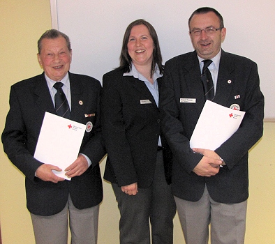 Verjüngungsprozess beim Roten Kreuz Zwei bewährte und altgediente DRK Mitglieder wurden von der Kreisbereitschaftsleiterin Alexandra Erni ausgezeichnet. Harald Bechthold (links) für 55 Jahre DRK-Mitgliedschaft und für 25 Jahre Schriftführer Thomas Preidl. (Foto: Gustel Mechler)(aum) Es geht wieder aufwärts mit der Ortsgruppe des DRK. Bei der Jahresversammlung am Freitag zeigte sich, dass sich die Mitglieder um den Vorstand scharen und ein Verjüngungsprozess stattfindet. Fußend auf einem Gerüst von erfahrenen Altgedienten steuert das traditionsreiche Eberbacher DRK mit einem stetig wachsenden Stamm von jungen Nachwuchskräften die Zukunft an.