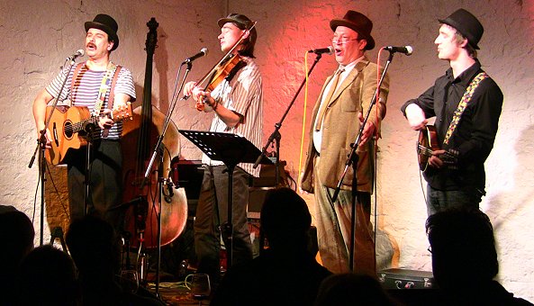 Zu hören gab es ein buntes Repertoire von Shanties, Folksongs, Balladen und Tanzliedern. Wie der Name schon vermuten lässt, handelt es sich bei dem Quartett nicht einfach um eine Band - es war ein Handelsunternehmen, das sich auf der kleinen Bühne präsentierte. Matz Scheid, Andrew Cadle, Manfred Maser und Mark Bloomer (unser Bild v.l.) haben sich auf den Handel mit Seemannsliedern spezialisiert. Manfred Maser, Erzähler und Sprachrohr der kleinen aber feinen Gesellschaft, sorgte mit einer Mischung aus Seemannsgarn und Geschäftsbericht für die Überleitungen im Programm, in dem es um Walfänger, Seelenverkäufer, Hafenspelunken, Fern- und Heimweh ging. Die von "Songrestaurator" Matz Scheid arrangierten Stücke präsentierte das Quartett nicht nur auf einer Vielzahl von Instrumenten, sondern auch in gekonntem mehrstimmigem Gesang.