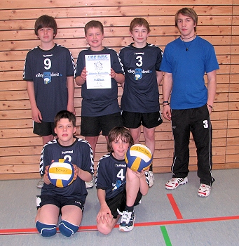 U14-Volleyballer bei den Süddeutschen Meisterschaften Hendrik Münch, Timo Seib (kniend v.l.), Jonas Mechler, Daniel Martynenko, Vitalij Rejmer und Trainer Bastian Schlickenrieder (stehend v. l.). (Foto: privat) (bro) (sch)Wie bereits in der vergangenen Woche bei der Süddeutschen Meisterschaft der U18, waren auch bei der U14 Volleyballer aus Eberbach für das Turnier, diesmal in Bad Waldsee, qualifiziert.