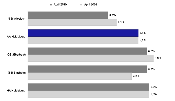 Aufwärtstrend in Eberbach Arbeitslosenquoten im April 2010. (Grafik: Bundesagentur für Arbeit)(bro) (aa)Ende April waren im Bezirk der Agentur für Arbeit Heidelberg 11.139 Personen arbeitslos gemeldet - 104 weniger als im März. Die Arbeitslosenquote im Bezirk ging um 0,1 auf 5,1 Prozent zurück, das ist der gleiche Wert wie im April 2009.