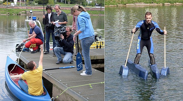 Damit die Moderatoren wissen, was sie den Kandidaten zumuten, durften sie die Übungen schon einmal selbst durchführen. Schon das Einsteigen in das Kanu war eine wackelige Angelegenheit - jedoch ein Kinderspiel gegen die "Wasserskier", die nach kurzer Zeit beide Moderatoren in den Neckar beförderten.