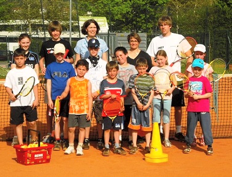 Tennisgrundlagen für Grundschüler Das Foto zeigt zehn Teilnehmer und in der hinteren Reihe v.l.: Alexandra Hamway, Lasse Schulz, Ursula Teichtmann (Konrektorin der Steige-Grundschule), Alexandra Wessely (Jugendwartin) und Florian Lenz (vom Trainerteam Voigt). (Foto: privat)(bro) (jsch)Im laufenden Schuljahr gab es von Oktober 2009 bis April 2010 ein Kooperationstraining des Eberbacher Tennisclubs mit der Steige-Grundschule. Das Training fand im Rahmen des Ganztagsangebots
