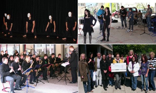 Kurzweilige Unterhaltung beim HSG-Frühschoppen O.l. "Ein-Blick" in die Arbeit beim Theater-Kurs, o.r. "All Eyes on!", die Oberstufen-Rockband, u.l. die Big-Band der Musikschule und u.r. die teilnehmenden Mütter beim Muttertagsgewinnspiel mit Dr. Herminghaus und Bettina Greif (4.v.l.) vom Vorstand der Freunde des HSG. (Fotos: Hubert Richter / Wörner)Mehr Bilder (Klicken zum Vergrößern):