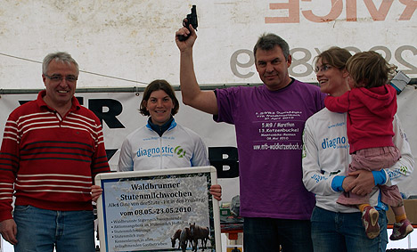 Elitebiker testen Stutenmilch Im Rahmen des Mountainbikerennens am Katzenbuckel fiel am Katzenbuckel der Startschuss zu den Waldbrunner Stutenmilchwochen. Bürgermeister Klaus Schölch (li.) zeigte sich erfreut über das Engagement der Organisatoren und Beteiligten um Jette Zollmann (re.). Radsportabteilungsleiter Peter Ihrig (2.v.re.) feuert den symbolischen Startschuss ab. (Foto: Hofherr)(hof) Das Mosca-Bike-Festival am Katzenbuckel nutzen am Samstag Bürgermeister Klaus Schölch und Jette Zollmann vom Kurgestüt Hoher Odenwald, um den Startschuss für die 1. Waldbrunner Stutenmilchwochen abzufeuern. Unterstützt wurden sie dabei von Peter Ihrig vom VfR Waldkatzenbach.