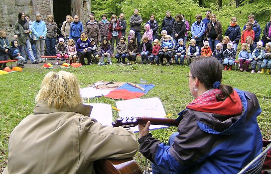 Familientag des Kindergartens St. Maria (Foto: privat)(bro) (uw) Einen schönen Samstag verbrachten die Kinder des Kindergartens St. Maria am 8. Mai mit ihren Familien auf dem Kirchel. Nach den Waldwochen im April waren die Kinder noch ganz vertraut mit dem Aufenthalt in der Natur. Gemeinsam mit den Erzieherinnen begrüßten sie ihre Eltern mit Liedern, Texten und Tänzen zu den Elementen Erde, Wasser, Luft und Feuer.