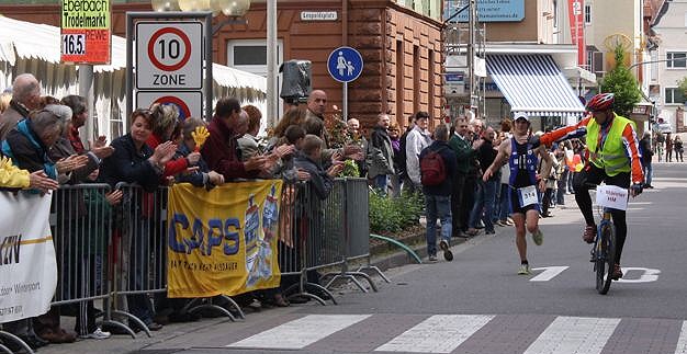 Bestes Laufwetter und neuer Streckenrekord beim CH-Alpha-Frühlingslauf Mit ständiger Fahrradbegleitung ins Ziel: Sieger Florian Brosch auf der Zielgeraden am Leopoldsplatz. (Foto: Mauritius-Thaddaeus Schell)Mehr Bilder (Klicken zum Vergrößern):