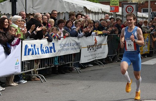 Bestes Laufwetter und neuer Streckenrekord beim CH-Alpha-Frühlingslauf Tobias Hegmann lässt sich beim Zieleinlauf im 10-km-Lauf von der begeisterten Menge beklatschen. (Foto: Mauritius-Thaddaeus Schell)Mehr Bilder (Klicken zum Vergrößern):