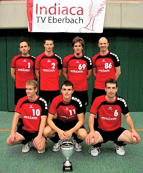 Indiaca-Team holt erneut den Meisterschafts-Pokal (Foto: privat)(bro) (dm)Nach der überraschenden Meisterschaft im Vorjahr triumphierte das Männerteam des TV Eberbach am vergangenen Sonntag erneut in der Baden-Liga Indiaca. Souverän verteidigte die Truppe um Spielführer Daniel Scheuermann am letzten Spieltag in Phillipsburg den ersten Tabellenplatz, obwohl der TVE nicht in Bestbesetzung antreten konnte. Somit sichert sich der TV Eberbach abermals die Teilnahme am Relegationsturnier um den Aufstieg in die 1. Liga.