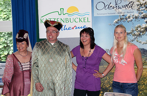 Dorfjubiläum auf dem Winterhauch Bürgermeister Klaus Schölch und Ehefrau Elke besuchten in historischen Gewändern den Stand der Gemeinde Waldbrunn, wo die Mitarbeiterinnen Anne Simon (r.) und Elke Schäfer viele Infos über die Winterhauchgemeinde bereithielten. (Foto: Jürgen Hofherr)Mehr Bilder (Klicken zum Vergrößern):