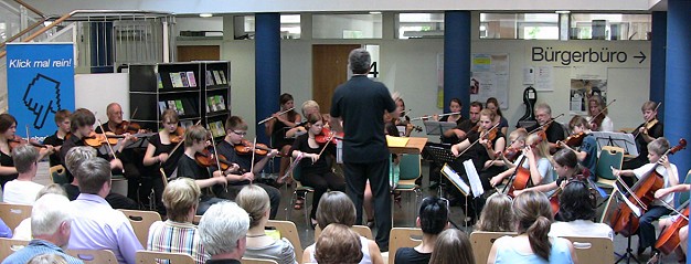 Gemeinsames Jahreskonzert mit musikalischem Nachwuchs (Foto: Hubert Richter)(hr) Zum Jahreskonzert hatte am vergangenen Sonntag, 4. Juli, um 18 Uhr das Kammerorchester der Musikschule Eberbach ins Foyer des Rathauses eingeladen.