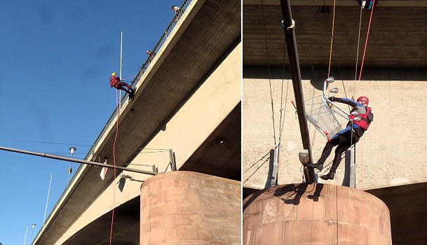 Kurz nach der Bergung des Einkaufwagens hing schon wieder ein Fahrrad in den Brückenseilen.