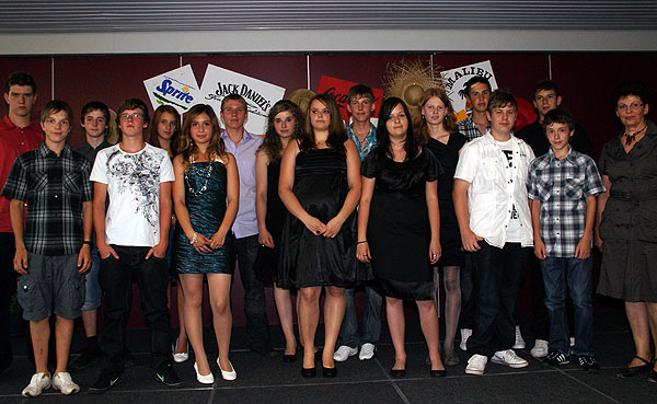 Die besten Schüler kamen durch Die erfolgreichen Schüler mit Klassenlehrerin Elke Schölch (re.). (Foto: Hofherr)(hof) Die Suche nach Ausbildungsplätzen wurde durch die Weltwirtschaftskrise erschwert, so Klassenlehrerin Elke Schölch bei der feierlichen Verabschiedung, dennoch ließen sich 18 Hauptschüler der Winterhauch-Schule Waldbrunn nicht beirren und absolvierten erfolgreich ihre Abschlussprüfung. Aus den Händen von Rektor Karl Völker durften die Jugendlichen heute in der Aula ihre Zeugnisse entgegen nehmen.