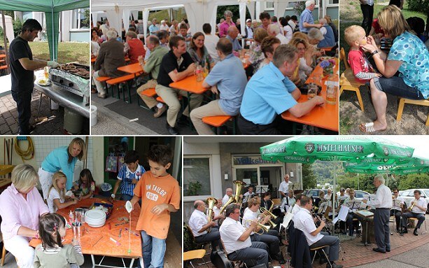 Anschließend bewirteten die zahlreichen Helfer bei herrlichem Sommerwetter die Gäste auf dem Platz vor der Unterkirche. Speisen und Getränke sowie Kuchen gab es in reicher Auswahl, und wem des draußen zu warm war, der konnte auch im Gemeindesaal Platz nehmen. Zur Unterhaltung spielte die katholische Pfarrkapelle unter der Leitung von Gustav Rumstadt.
