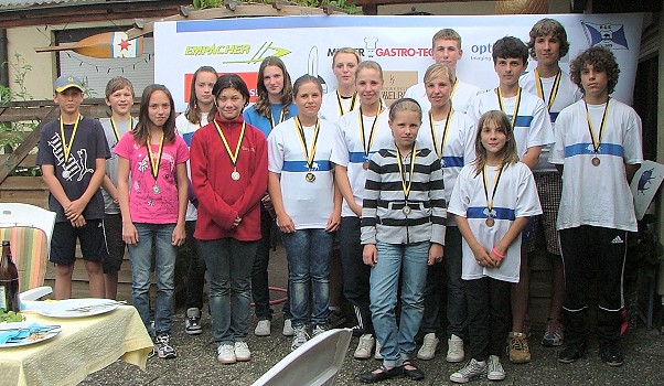 Medaillenregen bei der Landesmeisterschaft in Lauffen (Foto: privat)(bro) (ewa)"Alle Teilnehmer haben Medaillen gewonnen", verkündete stolz RGE-Vorsitzender Bernd Toenneßen beim Empfang der Rennmannschaft unter großem Jubel der großen Fangemeinde, die sich am Sonntagabend zum Empfang ihrer siegreichen Rennmannschaft auf der Bootshausterrasse eingefunden hatte. Müde und geschafft aber überglücklich war diese von der Landesmeisterschaft in Lauffen zurückgekehrt.