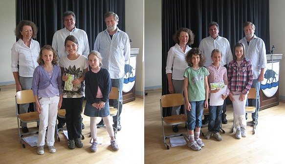 Jamila Strangfeld und Julia Schmitt sind die Sieger beim Vorlesewettbewerb Foto links: (v.li.) Fabienne Maier, Siegerin Jamila Strangfeld und Johanna Schulz; Foto rechts: (v.li.) Nastja Henn, Siegerin Julia Schmitt und Michelle Ihrig mit Maria Tropf, Rektor Manfred König und Stefan Frey (v.li.) (Fotos: Nicole Kolbe)(ko) Am Montagvormittag wurden die Sieger des Vorlesewettbewerbs der Dr. Weiß Grundschule ermittelt. Die Klassensieger der dritten und vierten Klassen mussten jeweils einen bekannten Text, den sie vorher üben konnten, sowie einen ihnen unbekannten Text vorlesen.