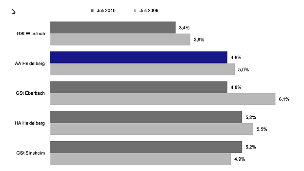 Anzeichen für eine positive Entwicklung mehren sich Arbeitslosenquoten im Juli 2010. (Grafik: Bundesagentur für Arbeit)(bro) (aa) Ende Juli waren im Bezirk der Agentur für Arbeit Heidelberg 10.422 Personen arbeitslos gemeldet - 161 weniger als im Juni. Die Arbeitslosenquote im Bezirk ging um 0,1 auf 4,8 Prozent zurück und liegt damit um 0,2 Prozentpunkte unter dem Vorjahreswert.