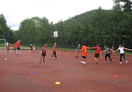20 Kinder beim Handball spielen (Foto: Nicole Kolbe)(ko) Im Rahmen des 12.Eberbacher Ferienspass lud am vergangenen Freitagnachmittag die Spielgemeinschaft Handball Waldbrunn-Eberbach zum Handball spielen für Kinder von 6–12 Jahre auf dem Kleinfeldplatz bei der Hohenstaufenhalle ein.