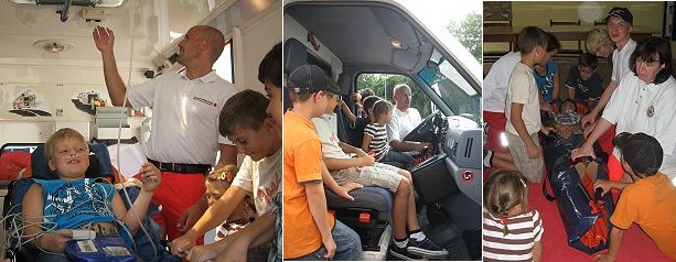 Dieser DRK-Rettungswagen war höchst interessant für die Kinder und Timo Lind, Rettungsassistent und Wacheleiter der hauptamtlichen DRK-Mitarbeiter wurde nicht müde die vielen Fragen der Kinder zu beantworten und ihnen zu zeigen, was so alles benötigt wird um Menschenleben zu retten.