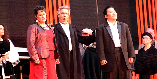 Festspiele bringen große italienische Oper ins Neckartal Fenena (Gundula Schneider, l.) und Ismael (Max An, r.) mit dem Hohepriester Zacharias (Thomas Mehnert). (Foto: Hubert Richter)Mehr Bilder (Klicken zum Vergrößern):
