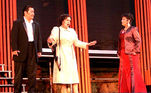 Festspiele bringen große italienische Oper ins Neckartal Die Widersacherin Abigail (Claudia Grundmann) tritt zwischen Ismael und Fenena. (Foto: Hubert Richter)Mehr Bilder (Klicken zum Vergrößern):