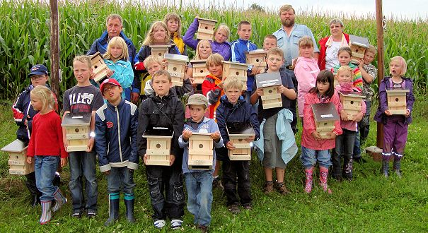 Flugs verwandelte sich die überdachte Terrasse in eine Schreinerwerkstatt. In Gruppen aufgeteilt, mit Helfern zur Seite, bekamen die Kinder die Holzzuschnitte für ihre Nistkästen. Schrauben wurden abgezählt, die Holzwände geschliffen, Löcher gebohrt, Werkzeug von Hand zu Hand gereicht und Holzwände verschraubt. Schließlich wurden die fertigen Nistkästen mit Namen versehen.