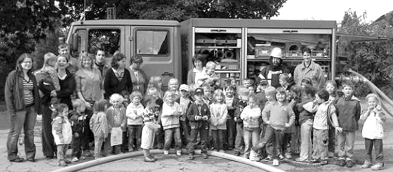 Kinder und die Erzieherinnen übten mit der Feuerwehr den Ernstfall (Foto: privat)(bro) (abl)"Was tun, wenn es brennt?" Unter diesem Motto führten der Kindergarten Villa Kunterbunt in Haag und die Freiwillige Feuerwehr Schönbrunn Abteilung Haag im Juli mehrere Veranstaltungen im Kindergarten durch.