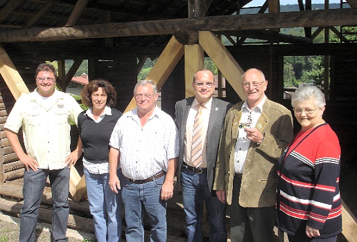 Sanierung der Schutzhütte am Waldstadion in Allemühl Die Spender Renate und Manfred Heiß, Bürgermeister Jan Frey, Wilfried und Inge Wäsch und Alexander Wäsch von der Bürgerinitiative "Schutzhütte am Waldstadion in Allemühl". (Foto: privat)