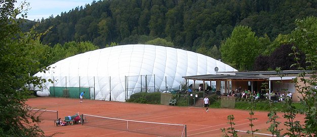 Die leichte Kunststoffhülle ist durch ein Metallgitter verstärkt und wird durch ein Luftgebläse gehalten, das im Inneren einen permanenten Überdruck erzeugt. Gut 1.000 Quadratmeter - zwei Tennisplätze - überspannt die Konstruktion. Die Halle wird per Gas beheizt und ermöglicht dem Club nun auch im Winter einen durchgängigen Trainings- und Spielbetrieb auf Sand und auf dem eigenen Gelände. Unter anderem fallen dadurch künftig die Fahrten zum Wintertraining nach Waldbrunn weg.