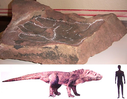 Der rund 30 Zentimeter lange Abdruck befindet sich in einem Sandsteinbrocken, der bereits im Jahr 1994 vom Eberbacher Künstler Michael Krauth am Scheuerberg oberhalb der Neckarhälde gefunden wurde. Lange war unklar, worum es sich bei dem Fundstück mit der eigenartigen Form handelte. Als Krauth den Stein dem Eberbacher Hobbygeologen und Heimatkundler Hans Klinge zeigte, befragte der etliche Fachleute. Der Geowissenschaftler Dr. Marco Lichtenberger war es schließlich, der den Abdruck als rechten Hinterfuß eines krokodilähnlichen Tieres aus der Zeit der unteren Trias identifizierte. Lichtenberger hat im Jahr 2007 ein Buch über "Saurier aus dem Odenwald" veröffentlicht und gilt als Kenner der Materie. Er ordnet den Urheber des Abdrucks mit hoher Wahrscheinlichkeit der Gruppe der "Erythrosuchier" zu, bis zu sechs Meter langen Fleischfressern, die sich vierbeinig fortbewegten. Auf unserer Abbildung unten hat Dr. Marco Lichtenberger ein solches Tier einem Menschen gegenüber gestellt.