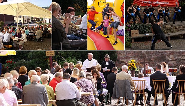 Schon beim ökumenischen Gottesdienst waren alle Sitzplätze belegt. Geleitet wurde er vom evangelischen Pfarrer Jörg Makarinus-Heuss und dem Diakon der katholischen Pfarrgruppe Neckartal, Dieter Klement. Der Heddesbacher Bläserchor begleitete den fröhlichen Gesang. Zum anschließenden Frühschoppen spielte das Akkordeon-Orchester Langenthal mit lustigen Weisen auf, und auf große Präsentationstafeln konnte man Fotos der vergangenen Dorffeste bewundern.