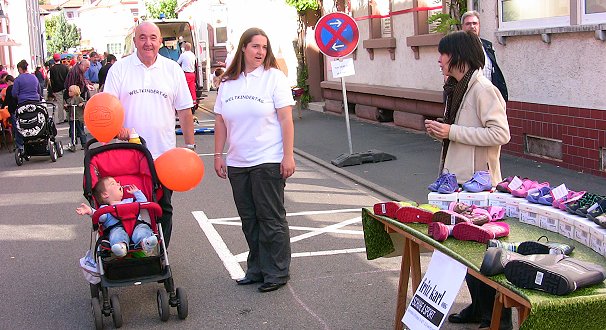 Für die Kinder wurde bei herrlichem Wetter ein buntes Programm geboten. Viele Firmen zeigten ihre Produkte rund ums Kind, der Kindergarten Regenbogen und das Spatzennest boten ein reichhaltiges Kuchenbuffet. Ein Karussell durfte kostenfrei ausprobiert werden, und Kinderschminken war ein absolutes Muss für fast alle kleinen Gäste, für die jede Menge Spiele angeboten wurden. Besondere Highlights waren die Fahrzeuge der Hilfs- und Rettungsorganisationen. So war die Freiwillige Feuerwehr Eberbach mit einem Löschfahrzeug zur Stelle, das Eberbacher Deutsche Rote Kreuz stellte einen Rettungswagen zum Anschauen zur Verfügung, und die Beamten des Polizeireviers in der Kellereistraße hatten trotz ihrer zusätzlichen Einsatzbelastung bei "Stuttgart 21" die Möglichkeit gefunden ein echtes Einsatzfahrzeug zum Anfassen in die umgestaltete Spielstraße zu bringen. Ein weiterer Höhepunkt war neben der Hüpfburg sicherlich auch Clown Silvia Pfannenstiel. Und dass ein Zahnarzt auch nur ein "normaler Mensch" ist, sahen die Kinder am Stand der Zahnarztpraxis Drs. Belcu, Joho und Fischer. Denn nach genaschter Zuckerwatte lernten die Kinder hier auch noch spielerisch, wie man Zähne putzen sollte.