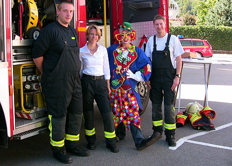 Kinder feierten für Kinder Jens Böhm, Sandra Eckhard und Jochen Fleck von der Freiwilligen Feuerwehr mit "Clown" Silvia Pfannenstiel. (Foto: Claudia Richter)Mehr Bilder (Klicken zum Vergrößern):