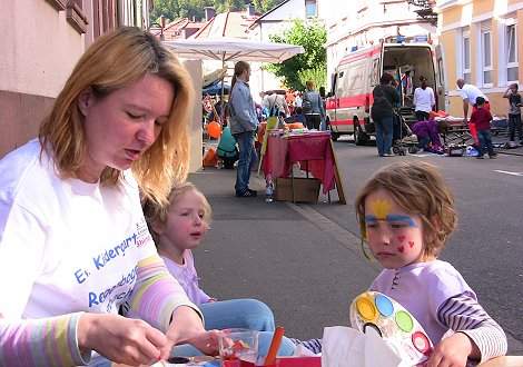 Für die Kinder wurde bei herrlichem Wetter ein buntes Programm geboten. Viele Firmen zeigten ihre Produkte rund ums Kind, der Kindergarten Regenbogen und das Spatzennest boten ein reichhaltiges Kuchenbuffet. Ein Karussell durfte kostenfrei ausprobiert werden, und Kinderschminken war ein absolutes Muss für fast alle kleinen Gäste, für die jede Menge Spiele angeboten wurden. Besondere Highlights waren die Fahrzeuge der Hilfs- und Rettungsorganisationen. So war die Freiwillige Feuerwehr Eberbach mit einem Löschfahrzeug zur Stelle, das Eberbacher Deutsche Rote Kreuz stellte einen Rettungswagen zum Anschauen zur Verfügung, und die Beamten des Polizeireviers in der Kellereistraße hatten trotz ihrer zusätzlichen Einsatzbelastung bei "Stuttgart 21" die Möglichkeit gefunden ein echtes Einsatzfahrzeug zum Anfassen in die umgestaltete Spielstraße zu bringen. Ein weiterer Höhepunkt war neben der Hüpfburg sicherlich auch Clown Silvia Pfannenstiel. Und dass ein Zahnarzt auch nur ein "normaler Mensch" ist, sahen die Kinder am Stand der Zahnarztpraxis Drs. Belcu, Joho und Fischer. Denn nach genaschter Zuckerwatte lernten die Kinder hier auch noch spielerisch, wie man Zähne putzen sollte.