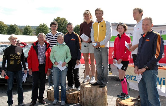 Neuer Streckenrekord beim 17. Beerfelder Duathlon Die Gesamteinlaufbesten fünf Männer und drei Frauen mit Gesamtkoordinatorin Ute Horn (1. v.l.) und Kreisbeigeordneter Hubert Drews (2. v.l.). (Foto: privat)(bro) (uh) Strahlender Sonnenschein, ein qualitativ hochwertiges und auf 175 Teilnehmer angewachsenes Starterfeld waren beste Bedingungen für den 17. Beerfelder Duathlon am vergangenen Sonntag.