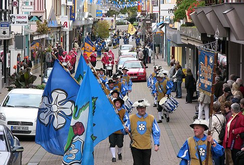 Um 13.30 Uhr startete schließlich die "Musikparade", ein Umzug mit schmissiger Musik und fliegenden Fahnen, den der Jubelverein anführte. Zahlreiche Gastkapellen reihten sich ein und zogen durch die Friedrichstraße, die Bahnhofstraße Ost, Hauptstraße und Kellereistraße zurück zur Stadthalle, wo die Feierlichkeiten mit einem Freundschaftsspielen noch stundenlang weitergingen.