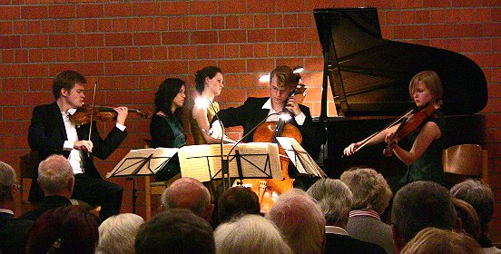 Der Mahlersche Klavierquartettsatz a-moll (1876/78), den man vor etwa 40 Jahren wieder entdeckte und den Mahler glücklicherweise nicht so radikal auslöschte wie behauptet, erwies sich als wirkliches musikalisches Kleinod, dem das Ensemble auch alle nötige Zuwendung zu Teil werden ließ. Über dem vorbereitenden Klangteppich des Anfangs erhob sich das klangvolle Dreitönethema mit einem Klavieranschlag, wie ihn wohl weibliche Pianistenhände besonders eindrucksvoll vollbringen können. Im Satzabschnitt “Entschlossen“ zeigte sich dann die andere Seite des jungen Ensembles, dass man nämlich mit instrumentaler Wucht zu spielen verstand, wobei dem Hang der Streicher zum breiten Musizieren die energische Pianistin - und das auch bei den anderen Werken des Abends - immer lebhaft entgegensteuerte. Dass Mahler auch an die Streicher dachte, zeigt die Violinkadenz am Ende, die nach seiner Anweisung vom Geiger, wie gewünscht, „ungemein rubato und leidenschaftlich“ vorgeführt wurde.