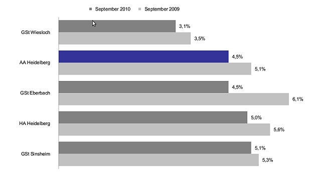 Wirtschaftliche Belebung erreicht den Arbeitsmarkt Arbeitslosenquoten im September 2010. (Grafik: Bundesagentur für Arbeit)(bro) (aa) Ende September waren im Bezirk der Agentur für Arbeit Heidelberg 9.844 Personen arbeitslos gemeldet - 620 weniger als im August. Die Arbeitslosenquote im Gesamtbezirk beträgt jetzt 4,5 Prozent und liegt damit um 0,6 Prozentpunkte unter dem Vorjahreswert.
