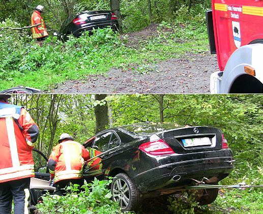 In den Wald gefahren (Foto: Claudia Richter)(cr) Glück im Unglück hatte heute Nachmittag eine 72-jährige Frau aus Eberbach beim Parken ihres Mercedes. Sie wollte das Fahrzeug auf einem Parkplatz am Breitenstein abstellen, als sie vermutlich aufgrund eines Bedienungsfehlers über das Bankett in den angrenzenden Wald fuhr. Buschwerk verhinderte das weitere Abrutschen am steilen Hang.