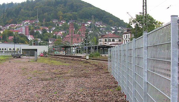 Queren der Gleise soll verhindert werden (Foto: Hubert Richter)(hr) Die Stadt Eberbach lässt derzeit einen Zaun zwischen dem Areal des ehemaligen Güterbahnhofs und den Bahngleisen errichten.