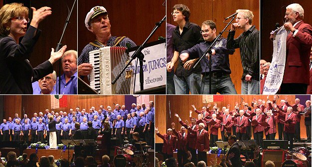 Musikalischer Cocktail aus Nord und Süd Oben v.l. die musikalische Leiterin Karin Conrath, ein "blauer Jung", drei der fünf "Rocky Harmonists" und ":Liedertafel"-Vorstand Olaf Fries mit einem Erinnerungshandtuch an Eberbachs 750-Jahrfeier vor 33 Jahren. Unten der MGV Liederkranz (l.) und die "Liedertafel" aus Geesthacht. (Fotos: Hubert Richter)Mehr Bilder (Klicken zum Vergrößern):