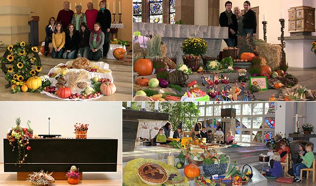 Die Erntedankgaben wurden von einzelnen Bäckereien, Gärtnereien und schwerpunktmäßig von Privatspendern zur Verfügung gestellt. Nach den Gottesdiensten wurden die Gaben teilweise an die Kindergärten verteilt, die hiervon in den nächsten Tagen eine gemeinsame Mahlzeit herstellen werden.