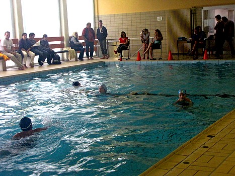 Wir bewegen uns „gegen den Strom“ war das Motto auf den verkauften Buttons, und man ließ es sich auch trotz des schlechten Wetters nicht nehmen, die Schule in ihrem Bestreben nach einer Sanierung des Bades zu unterstützen.