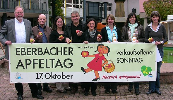 Neben den Gewerbetreibenden tragen auch viele Eberbacher Vereine - meist durch kulinarische Leckereien - zum Gelingen des Festes bei. "Natürlich kann man auch in diesem Jahr wieder Apfelmost direkt aus der Presse probieren", so EWG-Vorsitzender Dietrich Müller, der mit EWG-Mitgliedern das diesjährige Programm vorstellte. Die Äpfel kämen von Streuobstwiesen aus Eberbach, versicherte Müller. Um diese Wiesen hier in der Region erhalten zu können, spendet die EWG dem Naturschutzbund Eberbach (NABU) sieben Obstbäume, die in den Streuobstwiesen auf dem Breitenstein in den nächsten Wochen gepflanzt werden sollen. In einem Gespräch mit Heini Rumetsch vom NABU wurde der Bedarf an neuen Obst-Hochstämmen deutlich. Drei weitere Bäume spendete Michaela Falter von Falter-Fruchtsaft aus Heddesbach spontan. Auch für die Firma Falter sei der Erhalt der Streuobstwiesen wichtig, nicht nur für den exklusiv zum Eberbacher Apfeltag pressfrisch erzeugten "Herbstapfelsaft" aus Äpfel von heimischen Bäumen.