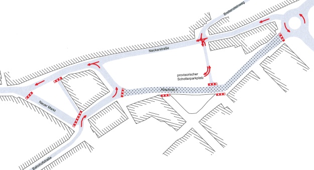 Asphalt wird ausgetauscht - In der Brückenstraße geht ab Dienstag nichts mehr Die Verkehrssituation ab Dienstag. (Grafik: StVE)(cr) Der angekündigte Austausch des mangelhaften Straßenaufbaus im Sanierungsgebiet "Neckarstraße I" (wir berichteten) soll in der kommenden Woche beginnen. Auf die Autofahrer warten Vollsperrung und Umleitungen.